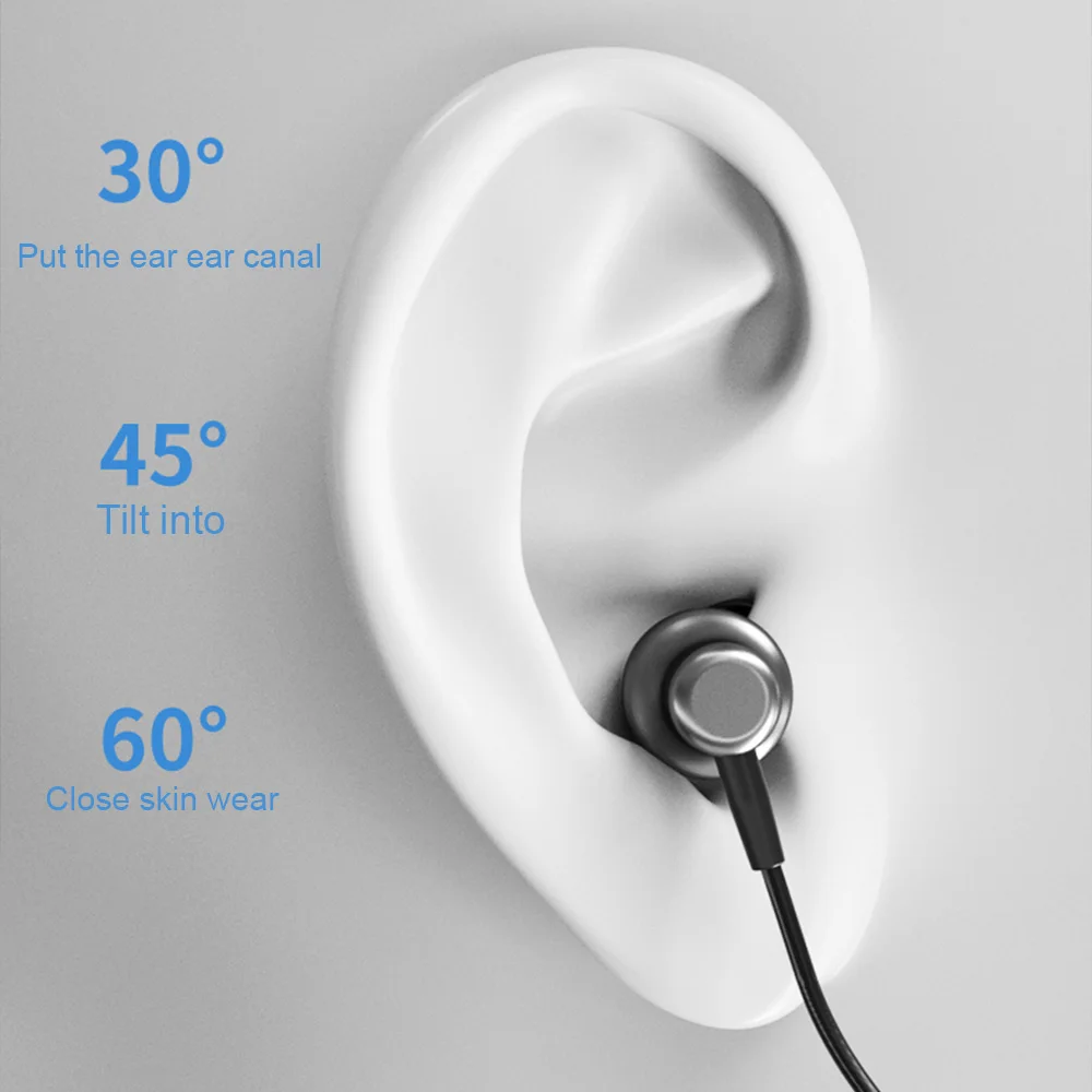 In-ear wearing, TPE neck hanging, metal ear case, volume adjustment.